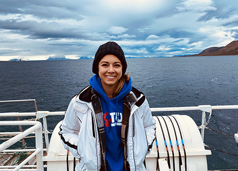 Kayt on a boat in the Arctic Ocean.